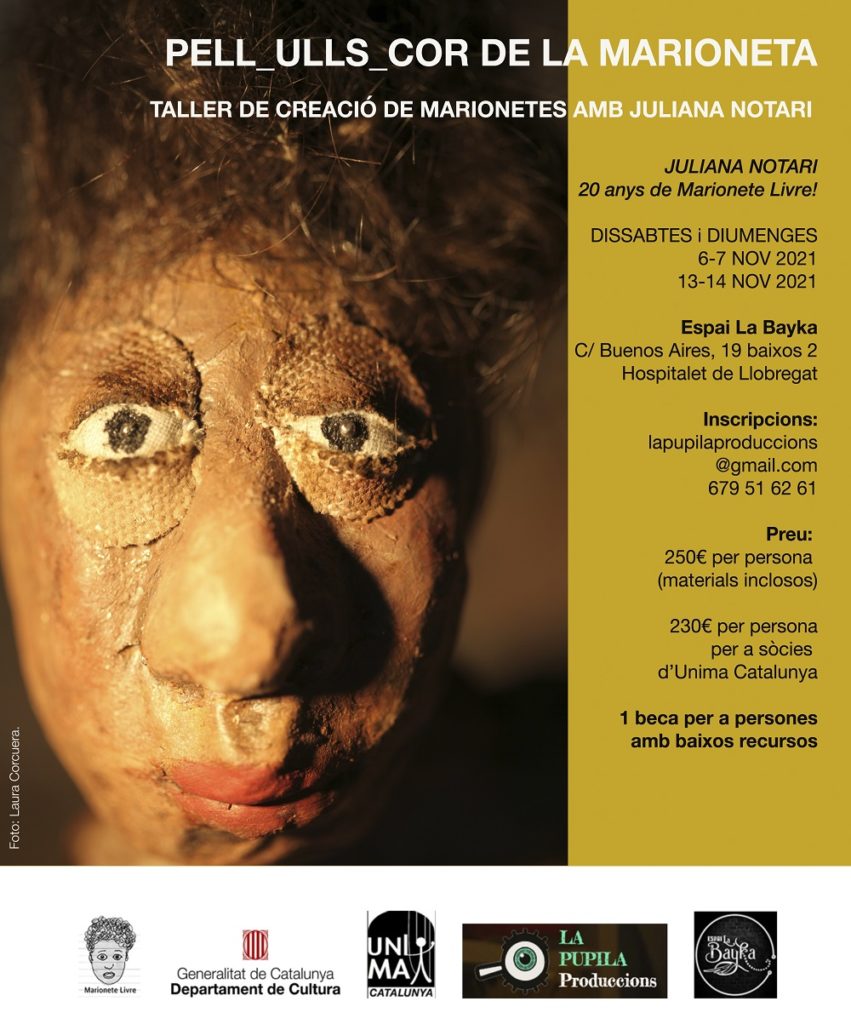La titellaire brasilera Juliana Notari proposa un taller intensiu de creació de marionetes des de la connexió corporal, visceral i subjectiva amb la matèria escollida per a la composició de textura, dramaticitat i gestualitat. El curs es fa a l’espai La Bayka (veure aquí), a l’Hospitalet del Llobregat del 6 al 14 de novembre de 2021.