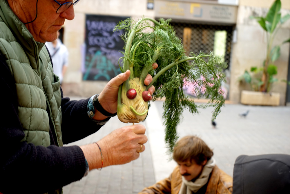 Mentrestant, Cuenta Caminos, un titella habitable de Mauricio Riobó, de la Cia. Mau Teatro, feia el seu recorregut per la plaça, connectant amb el públic des de l’humor i la improvisació.