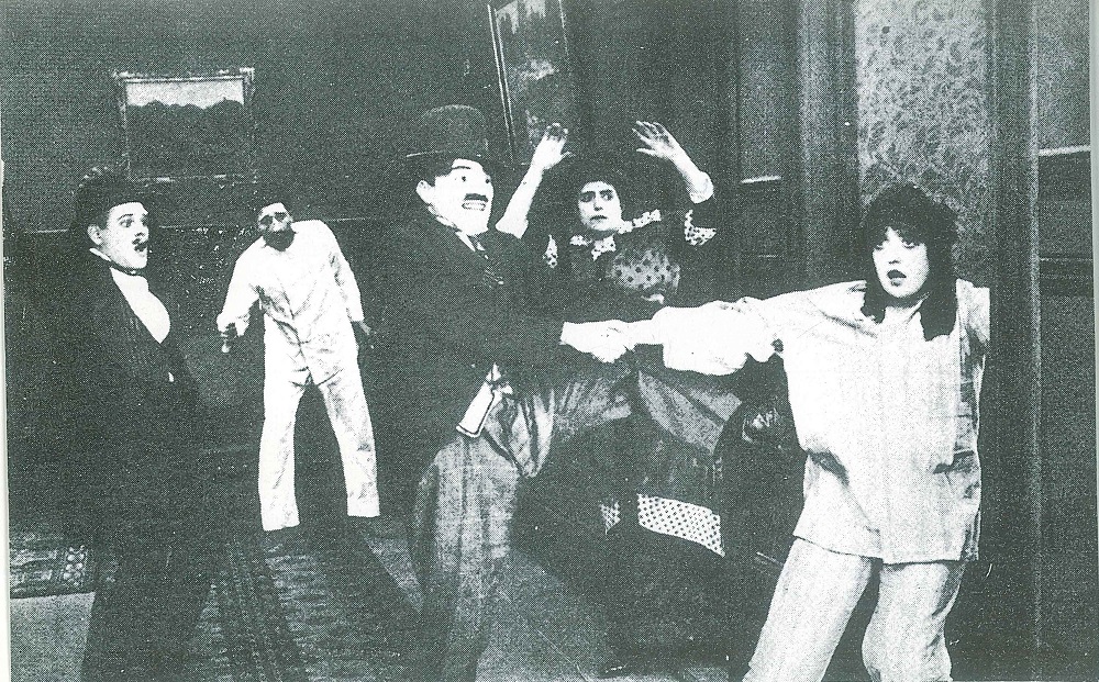 Tots cinc intèrprets, d’esquerra a dreta: Harri McCoy, Hank Man, Charles Chaplin, Alice Davenport i Mabel Normand, composen una escena histriònica, protagonitzada per personatges de farsa. Les expressions d’ulls molt oberts ens recorden les de molts titelles. L’emparentament entre llenguatges -cine i titelles- sembla evident i la semblança no és casual…