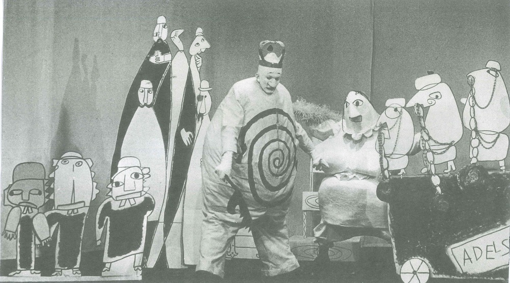 La imatge precedent ens mostra com la formalització dels personatges del Pare i la Mare Ubú, tot i ser interpretats per un actor i una actriu, s’inscriuen en una estètica explícitament titellaire materialitzada pels magnífics vestuaris i màscares dissenyats per Fabià Puigserver.