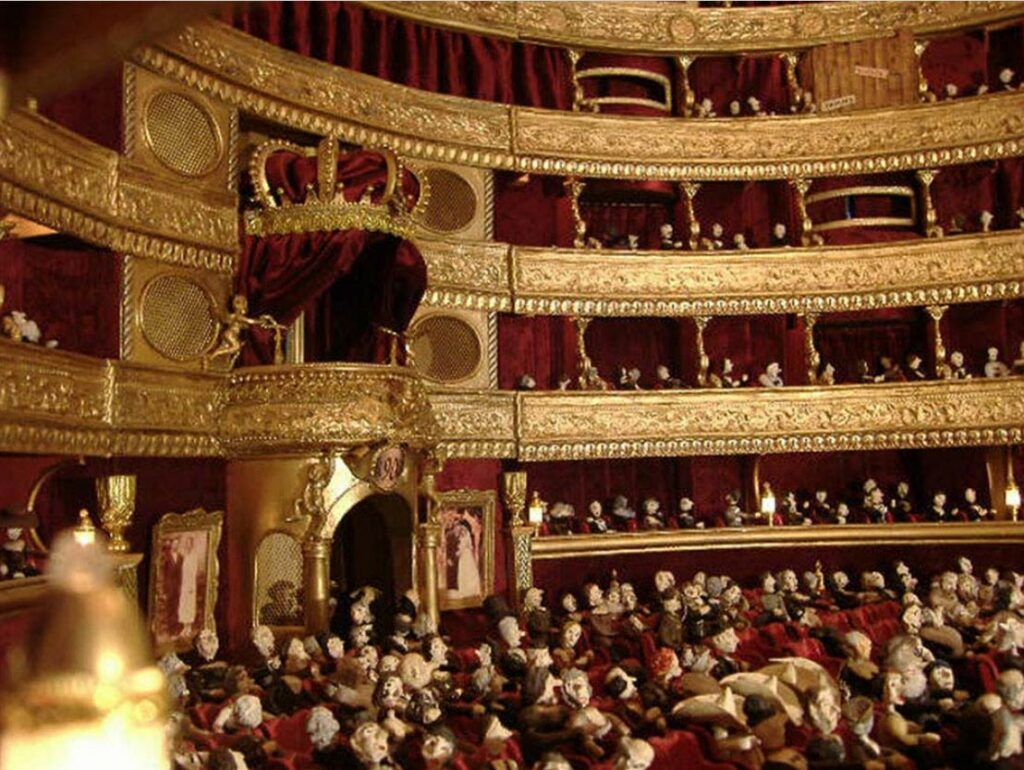 Sens dubte ens trobem davant d’una de les joies que vam poder veure a Palma, la recreació d’un teatre mecànic de 1900 feta per Alain Richet i Bettina Vielhaber, del Théâtre de L’Échelle, de Llenguadoc-Rosselló, França. Inspirat en els teatres mecànics en miniatura que era freqüent veure a les fires al tombant dels segles XIX i XX, l’Atelier Denino, com també es diu la companyia, ha construït un teatre clàssic a la italiana amb tot el seu luxe de cortinatges, velluts, làmpada de 1.200 cristalls, orquestra, 80 llotges, llotja reial, entre mil altres elements escènics, un teatre en el que hi caben 710 espectadors, els quals ocupen tots els seients de la sala.