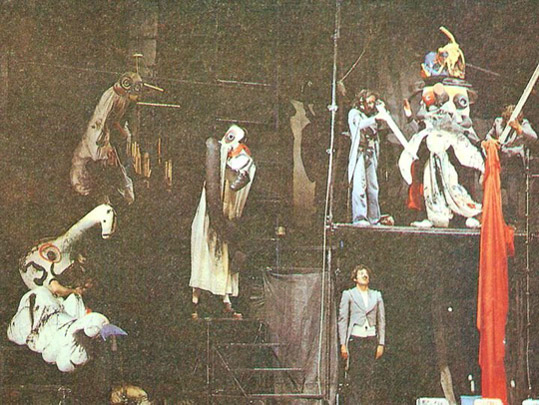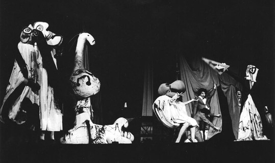Un fons escenogràfic de color verd i una estructura tubular practicable situada a dos nivells eren l’espai propici perquè altres actors vestits uniformement de verd, de manera que la forma dels seus cossos es confonia amb el color del fons, actuessin com a manipuladors invisibles d’uns altres elements expressius resolts plàsticament amb una formula a cavall entre la màscara i el titella per representar personatges extrets de la gent normal i corrent, del poble ansiós de revolució i de canvi. Màscares d’aparença blanquinosa i de formes imprecises que tapaven la cara i el cap dels actors, amb el toc pictòric de Miró al damunt per insuflar alè i palpitació al blanc inerme. I unides a la màscara, manipulades pels braços dels actors, una mena de potes o braços o tentacles (i aquí, el titella) de forma allargassada i arrodonida de colors mironians, que aconseguia suggestius jocs d’actitud, gest i moviment.