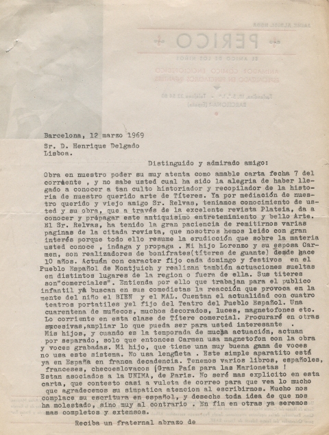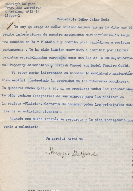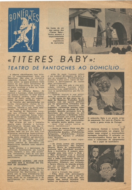 Carme Calvet, de Titelles Babi, ens ha fet arribar uns documents històrics sobre la relació que van mantenir, ella i el seu marit i company d’aventures, Llibert Albiol, amb el també titellaire i historiador portuguès Henrique Delgado a finals dels anys seixanta (veure aquí l’article dedicat al llibre escrit per Rute Ribeiro sobre Henrique Delgado). Consisteixen bàsicament en un parell de cartes creuades entre Lisboa i Barcelona, i en un article publicat per Delgado a la revista Plateia, en la qual disposava d’una pàgina fixa titulada “Bonifrates” (una de les maneres de dir “titelles” en portuguès). Un article que titula “Títeres Baby: Teatro de Fantoches ao Domicílio”.