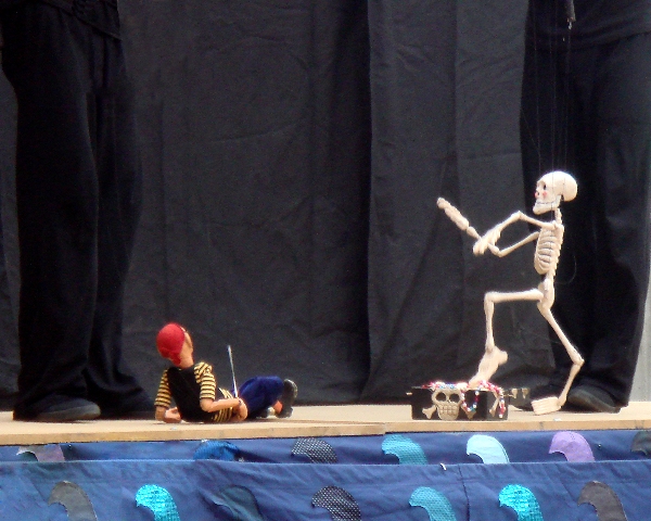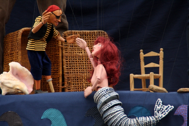 Ens trobem davant d’un espectacle de marionetes de fil que vol explicar una història, un repte sempre difícil quan a més es busca una simplicitat dels elements escènics que vagi d’acord amb l’essencialisme de la història, centrada en alguns dels elements bàsics de la mitologia aventurera: el pirata com arquetip de persona lliure, sobirana i autosuficient, el viatge, el mar, La sirena, la màgia i el bruixot, el Boig, la Mort, i els somnis d’una Illa amb un Tresor. Elements tots ells bàsics i arquetípics, ideals per ordir un argument senzill que vagi al gra. Crec que els dos titellaires de Somriures Nòmades han aconseguit filar tots aquests elements amb una història senzilla però ben farcida de ressonàncies poderoses, i gràcies a una acurada atenció en els detalls de la manipulació, que fa que les marionetes, de sofisticada tècnica de fil, es moguin amb molta gràcia i amb un curiós estil propi, marcat per una energia dels manipuladors que traspua rigor, modèstia i un clar esperit de sinceritat humana. Això fa que la presència dels dos titellaires que manipulen a la vista sigui correcta i agradable, sense estridències ni sobre-actuacions fora de lloc, essencial perquè les marionetes flueixin en la seva interpretació.