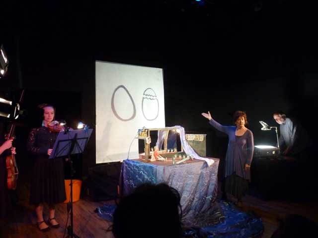 És la mateixa concepció dramatúrgica de l’espectacle la que dóna en el clau en incorporar dos elements exteriors a l’escenari pròpiament dit consistent en una taula on es concentra l’acció: a l’esquerra del públic el duet de violinistes encarregat d’interpretar els fragments musicals de Telemann, i, a la dreta, en Jordi Pujol en funcions de tècnic amb un retroprojector que li serveix per projectar imatges en moviment a una pantalla que es troba darrera la taula-escenari. Un tècnic, sí, però que intervé en l’espectacle com un element extern que tant pot entrar si vol a la història com posar-se a dirigir al públic animant-lo a cantar una cançó. Al centre, Joana Miralta és la conductora principal de l’obra, en manipular els titelles, posar i canviar els decorats, mentre alhora fa les veus dels diferents personatges.
