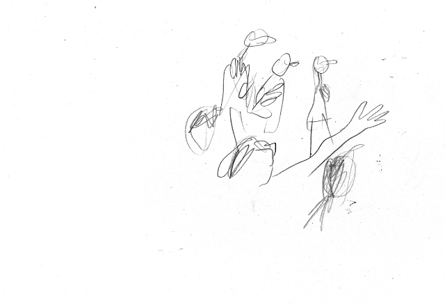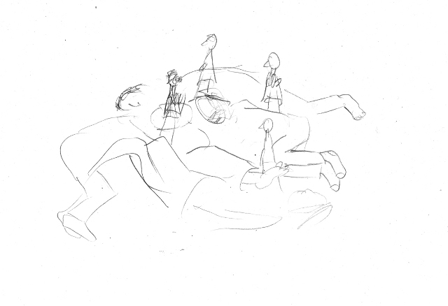 Finalment, en Luca ens proposa un darrer joc per avui: un planeta devastat, amb tots els cossos estirats al terra, dels quals, mica en mica, en neixen petits personatges, brots de vida no intel.ligent, però amb una extraordinària capacitat per ressorgir de les pròpies cendres. Cames, braços, caps i culs, formen part del seu paisatge, i se’n serveixen per créixer i desplaçar-se cap a un territori nou.