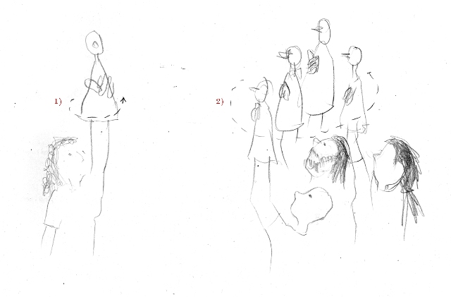 L’exercici es complica quan passem de treballar individualment a treballar en grup: els cossos dels companys esdevenen obstacles que el titella ha de tenir en compte a l’hora de desplaçar-se. Això comporta una mirada bifurcada de l’actor, ja que ha d’estar atent al titella (mantenint la verticalitat i la direcció cap on anava) i als altres actors (mantenint-ne sencers els peus!).