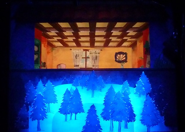 En aquesta segona història allò que destaca, a més de les veus i de la manipulació, és el muntatge escènic: de sobte, veiem com la taula on abans transcorria l’acció, es converteix de cop i volta en un complex teatret de titelles de dos nivells, el bosc a baix i la casa a dalt, la qual, a més, en donar-se la volta el decorat, es converteix en l’interior de la casa, recreada amb tota mena de detalls. Aquesta vistosa transformació escenogràfica, obra de Guillem Sánchez-Blanco (el qual també signa la direcció artística i el guió) permet que amb només dos únics personatges, la història flueixi a través de diferents escenes sense mai perdre el ritme ni l’atenció del públic.