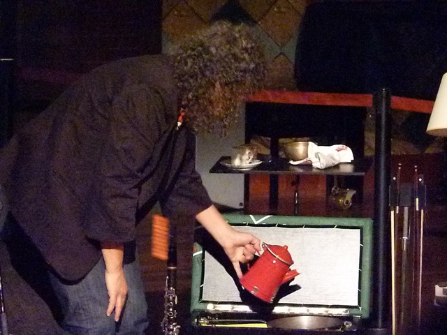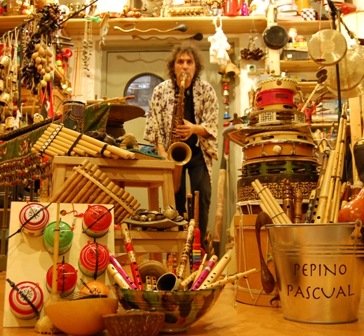 Una tècnica senzilla i casolana de l’electrònica, que va permetre a en Pepino desplegar tot el seu instrumental. I mai més ben dit: tot l’escenari era ple de caixes, maletes o tauletes d’on no paraven de sortir xiulets, campanes i campanetes, plats, pedres, carbasses, carbassetes, vibràfons, xeremies, calimbes, idiòfons de tota mena, güiros, xerracs, sonalls, sistres, maraques, cascavells, arpes de boca, kokirikos…. Seria impossible fer la llista dels instruments que va treure de la maleta o dels llocs on s’amagaven tots aquests instruments que molt sovint eren simples joguets o souvenirs pescats al vol d’algun viatge. Cada un d’aquests objectes feia el seu so, i el Loop l’engolia amb gana incontinent. Un cop aconseguida la salsa buscada i necessària, en Pepino es delia amb una improvisació de saxo, trompeta o de cafetera, un instrument que s’ha inventat i que es podria definir com “trompeta d’aigua de tapadora”.