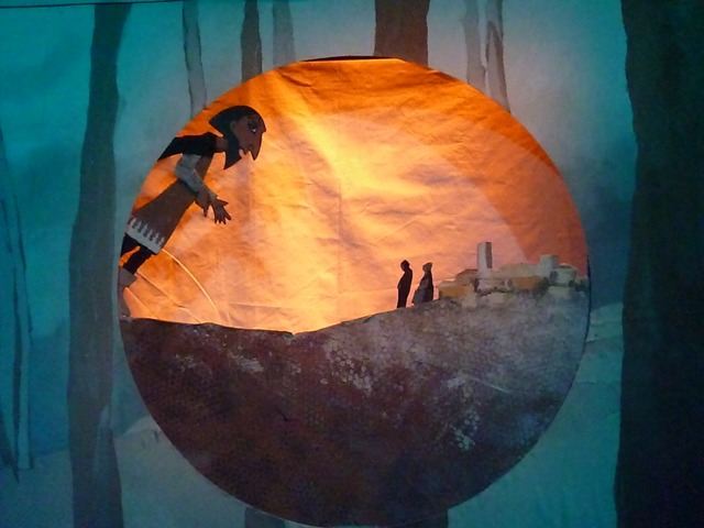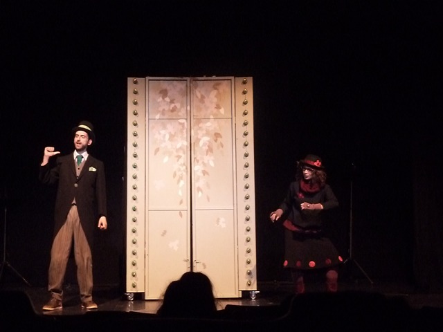 Molt original i ben resolt és el punt el partida escènic, un armari que sembla una màquina de viatjar en el temps i en l’espai, i que en obrir-se, desplega l’escenari on tindrà lloc l’acció pròpiament dita de la història, escenari que a la vegada és una mena de mur-castellet on apareixen els titelles –rèpliques dels dos actors entre altres– i on també s’obren les finestres per a les ombres.