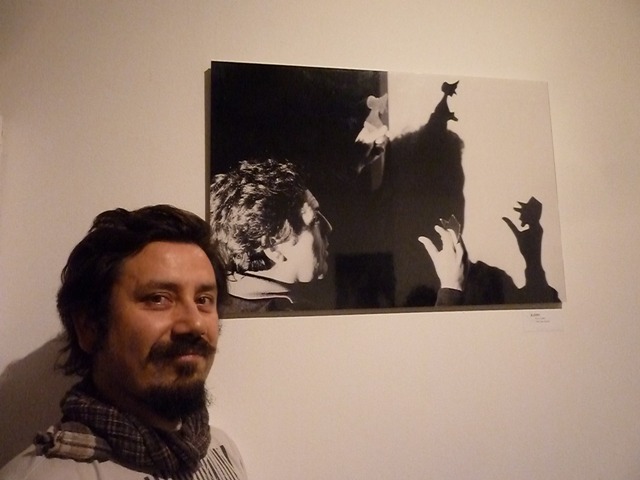 Felipe Cabezas davant la fotografia de Jesús Atienza amb el rostre de Xavier Lafita i unes siluetes.
