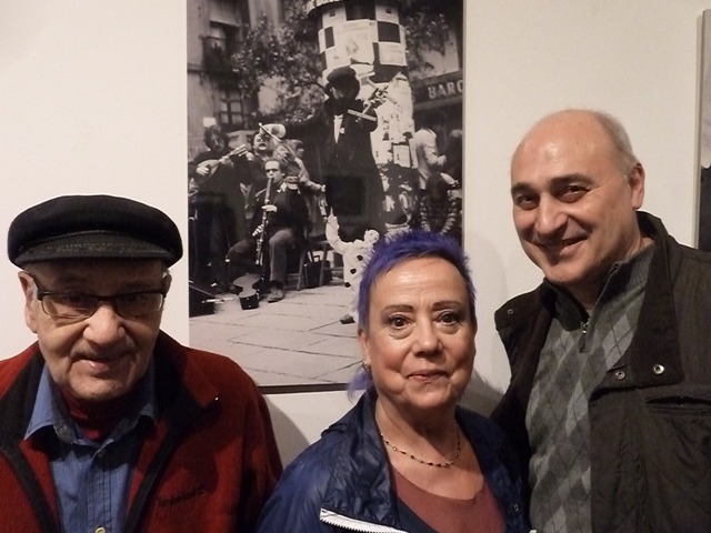 Llibert Albiol, Carme Calvet i Ferran Baile, davant una fotografia de Jesús Atienza, amb Carles Cañellas a la Plaça del Pi, i en Jordi Bertran tocant la guitarra al costat.