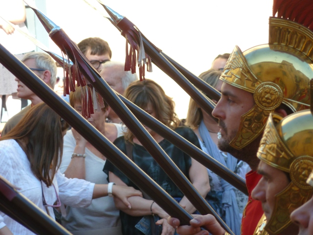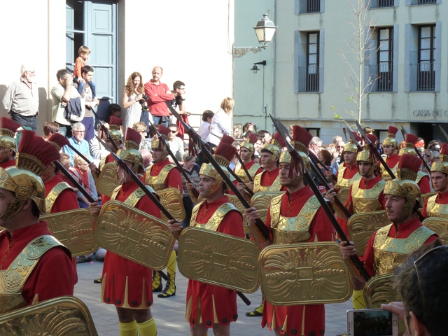 Fora de Barcelona, però, les coses són molt diferents. S’han conservat moltíssimes processons, amb un pes creixent dels elements pagans, com són les desfilades de “manaies” o de soldats romans, que en alguns llocs, com a moltes localitats de Girona, començant per la seva mateixa capital, adquireixen un relleu majúscul. Els carrers de moltes de les ciutats de Catalunya es veuen aquests dies ocupades per batallons de legionaris que constitueixen una mena de segons exèrcits voluntaris i anacrònics, però molt orgullosos d’exhibir-se i de marcar al pas al ritme dels timbals i amb tocs de trompeta que per regla general fan més referència als cornetes de l’exèrcit espanyol que als de l’antiga Roma.