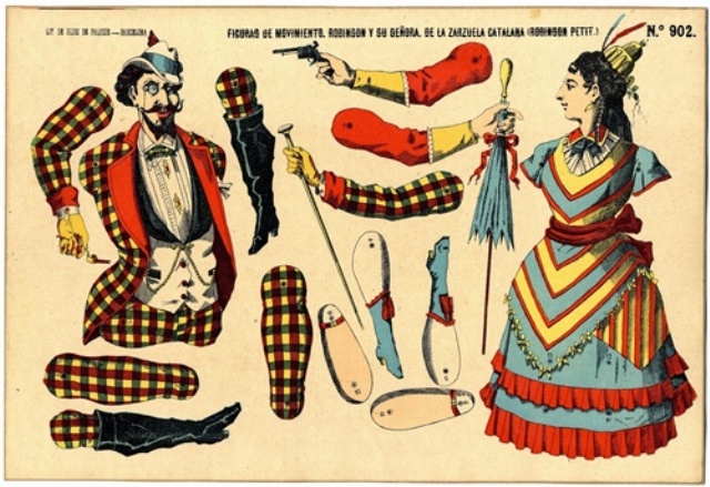 El caràcter tradicional que mantenen els titelles el podem veure amb exemples com els que surten al seu Costumari Català, quan fa referència que per la revetlla de sant Joan, quan els nostres avis eren infants, es construïen uns ninots de cartró retallat que les seves extremitats eren articulades amb un cordill, anomenats Joanots d’aigua, i que la canalla jugava fent-los així ballar. Més tard aquests ninots es van comercialitzar en forma de litografies impreses i Amades va anar recollint-les i col·leccionant-les, eren una mena de retallables de paper, la majoria d’elles eren impreses a França i feien referència a uns titelles vinculats a la Comèdia de l’Arte: arlequins, pierrots, colombines, pallassos …