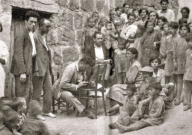 Joan Amades amb el músic Joan Tomàs l’any 1927 recollint cançons populars a Balaguer. Extret de Wikipèdia.