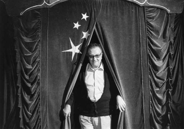 Joan Brossa travessant la cortina del Circ Perillós. Fira de Tàrrega, 1982. Fotografia Jaume Maymó