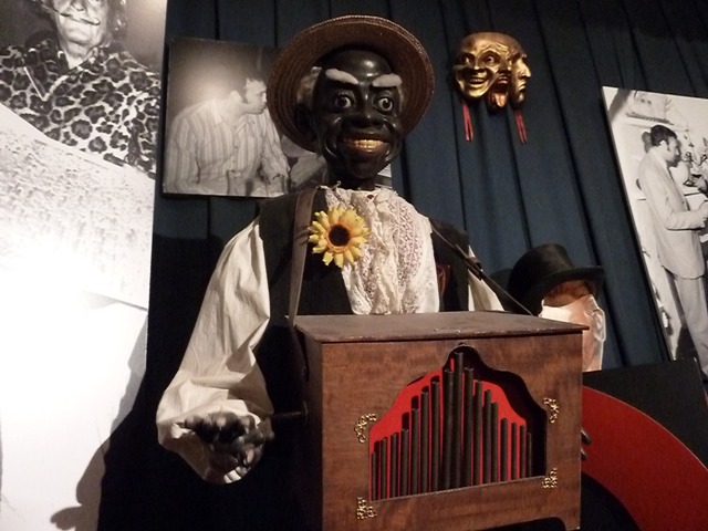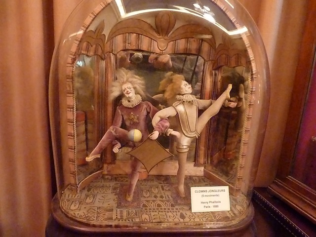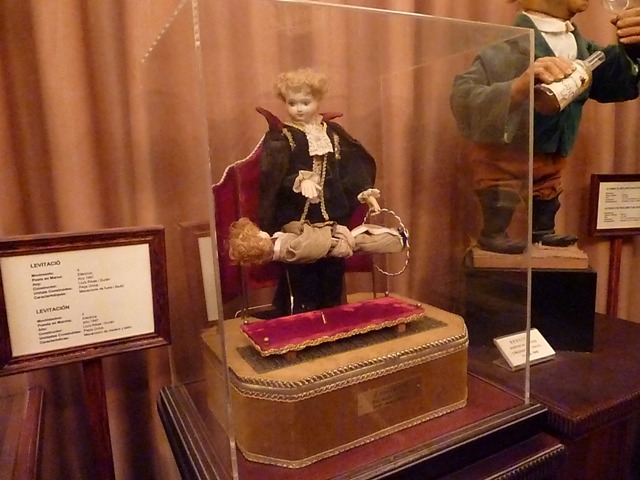 A l’esquerra, una nova sala d’autòmats, alguns d’ells verdaderes joies. Sens dubte ens trobem en un dels Sancta Sanctorum del Museu: la noia que levita i es fica dins el cercle del mag, el sol i la lluna que es substitueixen damunt d’un cos sense cap, dos pallassos magnífics ballen entre miralls -peça francesa de l’any 1880, segurament l’autòmat de més valor de la col·lecció.