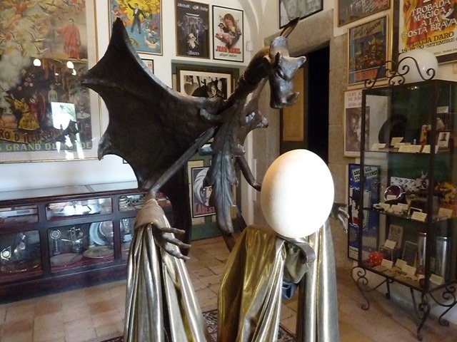 Entrem i un autòmat amagat entre cortines ens interpel·la: la pitonissa. Una mà assenyala la carta del nostre destí. Peça dels anys seixanta, semblant a la que hi ha també al Tibidabo, segurament exhibida a l’Apol·lo. Un drac amb un ou al davant ens dóna la benvinguda. És el Guardià de la Porta. Controla el vestíbul i fita a tot aquell que entra. L’ou ens indica que la nostra visita es pot convertir en un nou origen. Els ous contenen móns encara per desplegar-se. Potser ens l’ofereix? O ens l’hem de guanyar? El drac, una peça de ferro colat propi de l’artesania catalana, rau hieràtic, més amable que amenaçador. Darrera, veiem el fenomen acumulatiu de les peces en vitrines i armaris de vidre: jocs de mans de tota mena, daus, cartes, varetes màgiques, llibres sobre la matèria, fotografies, miralls, cubilets… I penjats a les partes, cartells històrics fabulosos, de mags llegendaris dels segles XIX i XX, o dels múltiples congressos i certàmens de màgia, molts d’ells organitzats pel propi Xevi.