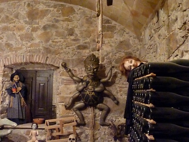 Abans de pujar als pisos de dalt, visitem la cava o més aviat les masmorres: botes de vi, caps tallats, esquelets, calaveres, una nina, i la deessa Kali representada per una figura immensa articulada de fusta tallada. Te la trobaves quan anaves en vagoneta pels túnels de les Atraccions Apol·lo: bellugava els braços i treia la llengua.
