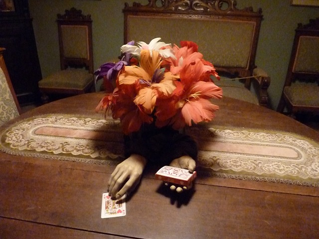 En una altra habitació, unes mans donen cartes damunt d’una taula. Enlloc apareix el cos: són unes simples mans màgiques. A dreta, dins d’una vitrina, dos ninots de ventriloquia de la família Roca. El seu realisme demacrat produeix una certa sensació d’angúnia. No se’ls veu gaire feliços. Potser enyoren els escenaris.