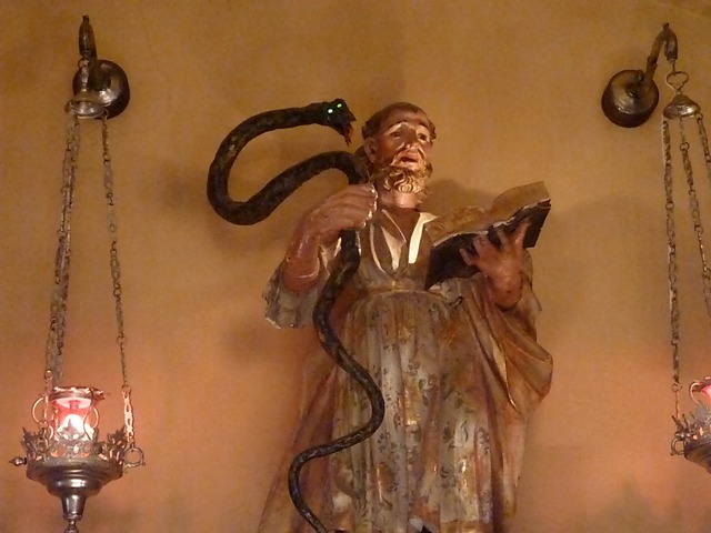Al costat de les cavalleries convertides en espai de fira, una nova sorpresa: la casa té una capella –on per cert s’hi van fer les primeres misses després de la Guerra Civil a Santa Cristina d’Aro– dedicada a la meditació religiosa, amb una figura que domina darrere l’altar: la de Simó el Mag! Una inquietant imatge amb una serp d’ulls brillants al costat. Una capella pagana i ambigua, com no podia ser d’una altra manera, que reivindica la figura d’un sant que no acaba de ser sant, una devoció envers qui va ser, segons sembla, un dels primers mags professionals que han passat a la història… Inquietant i poètic.