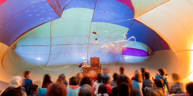 Una ocurrència genial i estrambòtica, que enllaça com anell al dit amb el contingut que proposen en Jordi Palet, director i autor de la dramatúrgia, i els seus dos còmplices i actors-titellaires, en Pep Farrés i en Jordi Farrés. I és que la mateixa carpa on el públic és instal·lat es converteix en la gran metàfora de l’espectacle, en esdevenir un globus aerostàtic per volar pels espais multidimensionals de la imaginació. O dit d’una altra manera, l’univers de tot allò que no es veu però es somia i s’imagina, encarna i dóna forma al globus on romanem tancats. Amb jocs de llum i ombres, i amb el moviment del globus, ben manipulat pels dos responsables de la navegació, es dóna vida i es fa visible allò que sempre serà invisible, però que no per això es fa real durant la duració de l’espectacle.