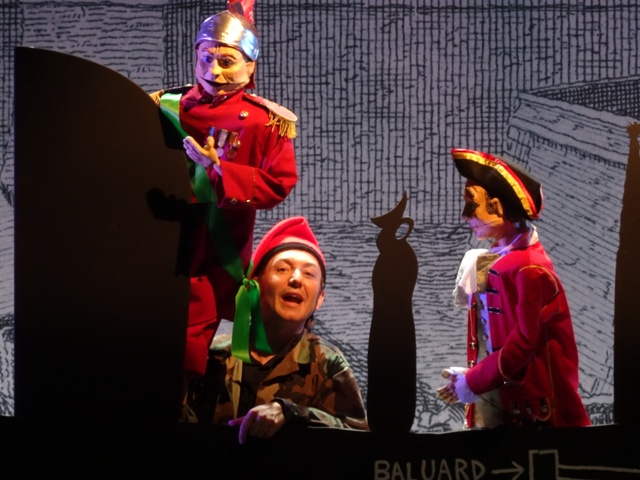 Els titelles imposen la seva realitat als demés personatges, que en certa manera queden ‘titellitzats’, tot i que ells es pensen que no ho són, de titelles. Crec que aquí als autors els hi hauria agradat molt una mica més de temps d’assaig per poder treure tot el suc possible a aquesta contaminació mútua entre actors i titelles, tot i que l’essencial queda apuntat sobretot per la feina feta pels mateixos actors, que han comprès molt bé aquest efecte d’emmirallament. En el fons, tots tres actuen com si ells fossin els titelles, simples fantotxes caricaturescos, manipulats pel Temps, l’atzar i les necessitats, mentre són contemplats per uns altres jos seus, hieràtics i inquietants (les marionetes que surten per damunt del Sky Line de Barcelona), que semblen mirar des del món de la mort els inútils esforços i les inconfessables misèries del humans encara en vida.