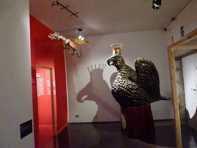 Aquí, l’àliga no podia faltar. Ja sigui bicèfala o d’un sol cap, ha estat símbol per excel·lència de reialmes i monarquies, també de poders imperialistes i totalitaris. I també, -valguin el desdoblament o alteritat de condició contradictòria- segons el context cultural que la ha fet seva, símbol de total i màxima llibertat