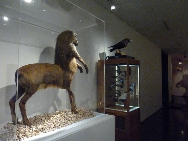 I també ha creat tot tipus d’antropomorfismes, com poden ser sirenes, centaures, minotaures, esfinxs, sàtirs, etc. O com una figura aquí exposada que m’impressiona… i pel seu acabat realista sembla un animal de debò, però extret d’una fauna mitològica. És meitat cabra, meitat mico. Una creació de Pere Formiguera i Joan Fontcuberta. Es diu Centaurus Nandertalenses