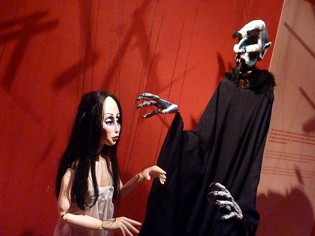 El vampir literari i cinematogràfic viu una existència del tot desdoblada i del tot alterada entre la passivitat dorment del dia i l’activitat xucladora de la nit…, similar a la doble vida dels titelles, que a estones dormen al calaix i a estones són a l’escenari ben vius, i potser, representant personatges tan perillosos com el vampir…