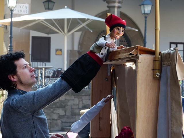 A la Plaça Major, ha estrenat el seu nou espectacle de titelles de guant a la manera tradicional en Néstor Navarro, de La Puntual, aquest jove titellaire que fa cosa d’un parell d’anys va decidir llançar-se a la carrera professional. El seu espectacle enllaça amb la tradició dels titelles europeus de la família putxinel·lesca, una tradició que avui en dia està adquirint uns trets generals com si es volessin escapar dels particulars que abans definien les formes de cada país. És a dir, el titellaire que avui s’endinsa en aquesta tècnica -certament, una de les més difícils que hi ha- parteix d’uns referents que inclouen el Punch anglès, el Pulcinella napolità, el Dom Roberto portuguès, més les mil altres variants particulars que existeixen arreu. En la paleta de gags i recursos que el titellaire utilitza, hi ha una gran riquesa d’elements diversos que estableixen un punt de partida obert, ja no condicionat per les lliçons de cap mestre concret ni de cap repertori nacional. Amb aquesta superació de les identitats nacionals, el personatge comodí de Putxinel·li d’alguna manera s’ha europeïtzat, tot i que també podríem dir que s’ha universalitzat.