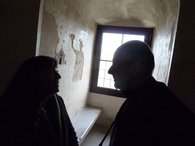 Enrique Lanz i Yanisbel V.Martínez davant la finestra des d’on figura que Melisendra (la princesa protagonista de la història que explica maese Pedro amb titelles) va escapar, segons ens indica Cervantes. La Aljafería de Zaragoza. Foto de Toni Rumbau.