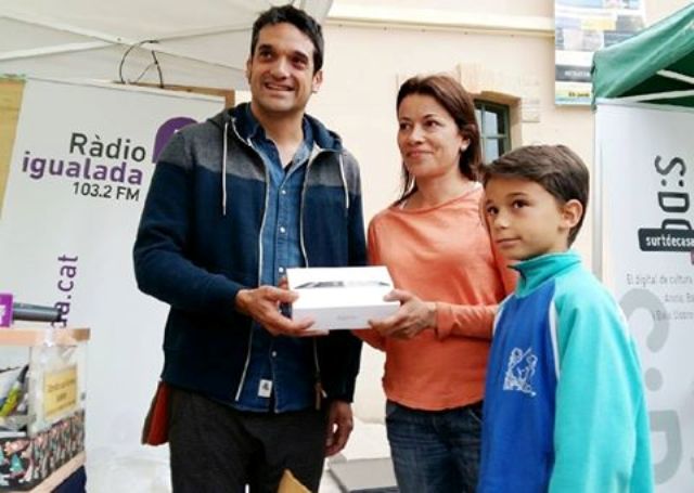 Pep Farrés, director artístic de la Mostra, entrega el premi del Joc del Comerç de La Mostra a la igualadina Assumpta Costa. Foto de la Mostra d’Igualada.