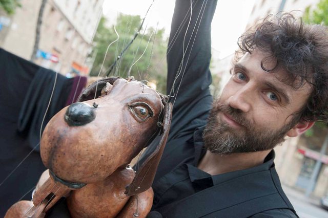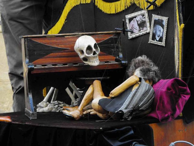 Ángel Navarro venia a continuació amb el seu ‘Gildo, el artista narcoléptico’, un dels joves valors que tenim a Barcelona dedicat al fil, una tècnica que domina amb increïble virtuosisme. La temàtica de l’obra es centra en la mort, amb uns bons esquelets que van encantar al públic, fascinat per aquests números clàssics de la marioneta de fil. (veure aquí)