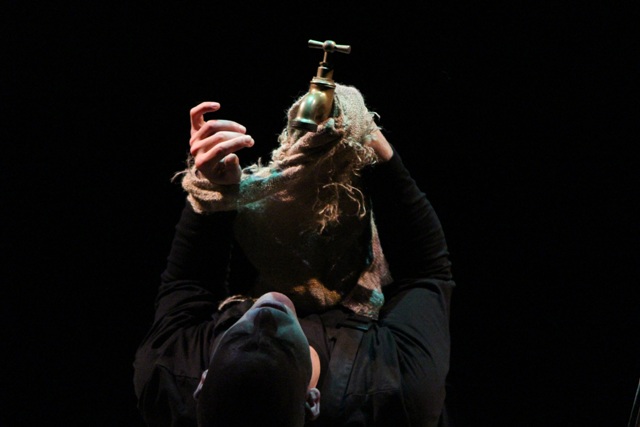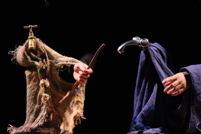 En L’Avar, versió molt lliure de l’obra de Molière, són dos els titellaires manipuladors (l’esmentat Miquel Gallardo i Asier Saenz) encarregats de donar vida als titelles, els quals actuen a la vista però sense dissociar-se dels personatges manipulats. Uns titelles d’una originalitat majúscula, creats al seu dia per en Jordi Bertran (veure aquí), i que consisteixen en simples aixetes a les quals se les vesteix amb un simple tros de roba. L’altra originalitat és la substitució dels diners que l’avar recull, per l’aigua, un element esdevingut preciós i cobejat per tothom, en un món on les persones s’han convertit en aixetes seques i ansioses d’aigua. Una ocurrència realment genial que s’adapta a la perfecció a l’obra de Molière.