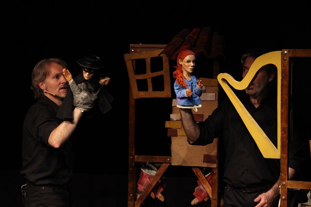És ja la segona vegada que veig aquesta obra, fruit del repte que un dia es van plantejar aquests dos mestres titellaires, l’Eduard Ferré i en Luca Ronga, d’inventar un llenguatge basat en la tècnica del Titella Català, però absolutament despullat pel que fa a les ànimes dels titelles i al castellet on solen amagar-se els manipuladors. És a dir, els espectadors veuen els titelles a les mans dels titellaires només amb la part superior dels seus vestits, sense la llarga ànima que normalment tapa el braç del manipulador. I, a la vegada, s’ha eliminat el paravent que amaga els titellaires, tot i que sí s’han mantingut tres esquemàtiques estructures que serveixen per penjar decorats o els mateixos titelles, i a la vegada marcar l’espai escènic de l’obra.