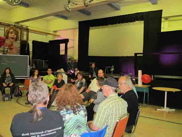 Després es podia escollir entre la conferència de Rosario Alarcón, art-terapeuta andalusa establerta a França, que ens relatà el descobriment de vuit etapes de creació amb tallers de titelles que feien descobrir la pròpia història més íntima a la persona i ajudaven a curar els problemes mentals, o la conferència de Denise Timsit, psicoanalista francesa junt a Valérie Gentile, titellaire, que parlaven de les seves experiències on la marioneta actuava com a mediadora i ajudava a la construcció i a l’afirmació del propi jo.
