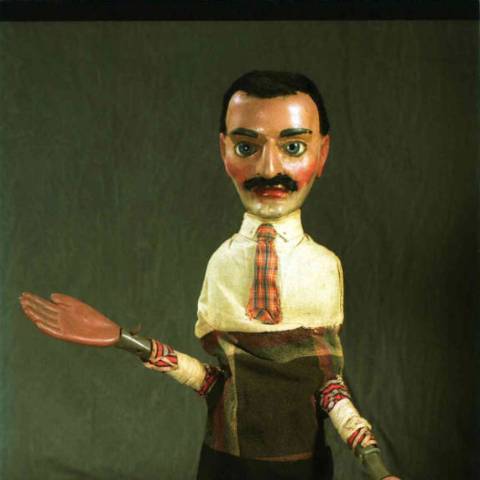 Els germans Josep i Jaume Anglès treuen el titella de la Mort, en una visita al MAE.