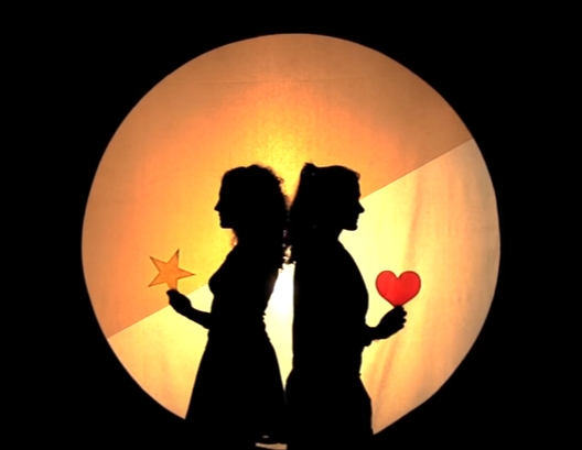 És la paradoxa de la dualitat interior allò que s’escenifica a l’escenari, una dualitat que ens remet a la subjectivitat personal (el cor) i a l’alteritat més extrema i llunyana (l’estrella). I res millor per expressar aquesta paradoxa de les contradiccions a la vista, que aquest joc d’estar a dos llocs a la vegada, davant i darrere, amb llum i amb ombra, dins i fora. Una dualitat que les dues ombristes manipuladores encarnen com a personatges.