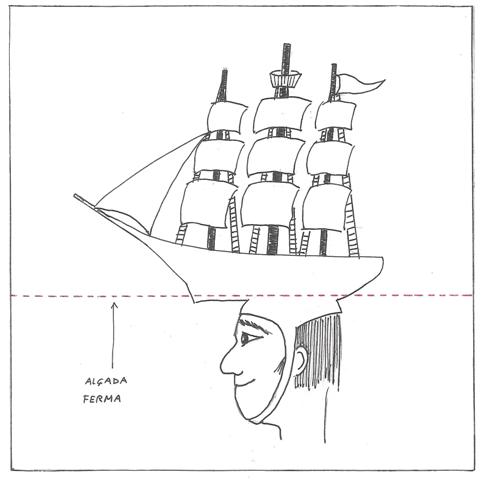 Lògicament, tot el que hi darrera la ferma resta ocult. Protegit per aquesta invisibilitat, un tramoista camina lentament i amb parsimònia mentre creua l’escenari, tot transportant damunt el cap –visible pel públic- un vaixell. En el dibuix: un veler amb les veles desplegades…