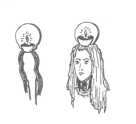El titella de casquet, força inspirador!, em remet també a un altre truc escenogràfic, aquest més llunyà en el temps, localitzat en el teatre religiós medieval. Un cert parentesc amb el titella de casquet és ben detectable. Consistia en un dispositiu que, a la manera d’un casc, es lligava sota el mentó i servia per a sostenir damunt el cap un recipient en forma de bol, ple d’aiguardent encès.