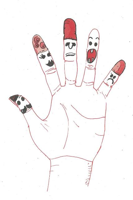 Més economia de mitjans impossible, els dits del manipulador són al mateix temps els titelles exhibits. Fins i tot poden ser també l’argument, només cal empescar-se una història que comenci en el dit gros i acabi en el petit o viceversa. La construcció molt a l’abast, senzillament: dits nets o bruts si convé…, un pinzellet i pintura, o un retolador, o un bolígraf, o un llapis.