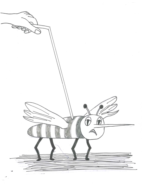 El manipulador controla el titella per sota de la seva cintura i podríem considerar aquesta manipulació com una variant del titella de taula. Però segons quina sigui la naturalesa del titella, a moments caldrà ampliar la manipulació per damunt del cap del manipulador, com en el cas del personatge que ens mostra el dibuix: una abella o insecte similar, que pot caminar, pot saltar i,per suposat, pot volar!
