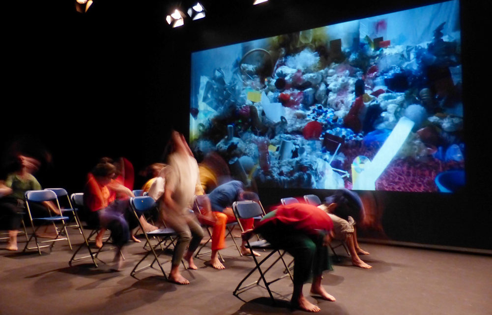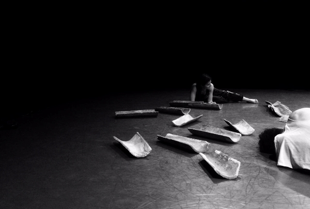 Tres actors o ballarins interactuaven en l’espai immersos en una feina concreta que marcava tots els seus moviments: traslladar d’un lloc a l’altre un conjunt de teules escampades per l’escenari.