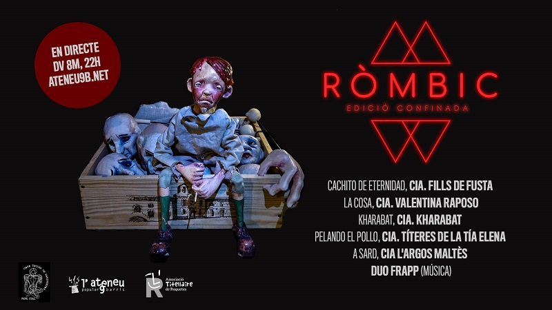 El divendres 8 de maig de 2020, a les 22h, es presentarà en streaming una edició especial del Ròmbic, el Festival de Titelles per Adults de Barcelona, organitzada per l’Associació Titellaire de Roquetes conjuntament amb la Casa Taller de Marionetes de Pepe Otal. Aquesta és la solució on line i de petit format que l’activa Associació de Roquetes ha considerat convenient i possible, davant l’actual situació de confinament del COVID19.