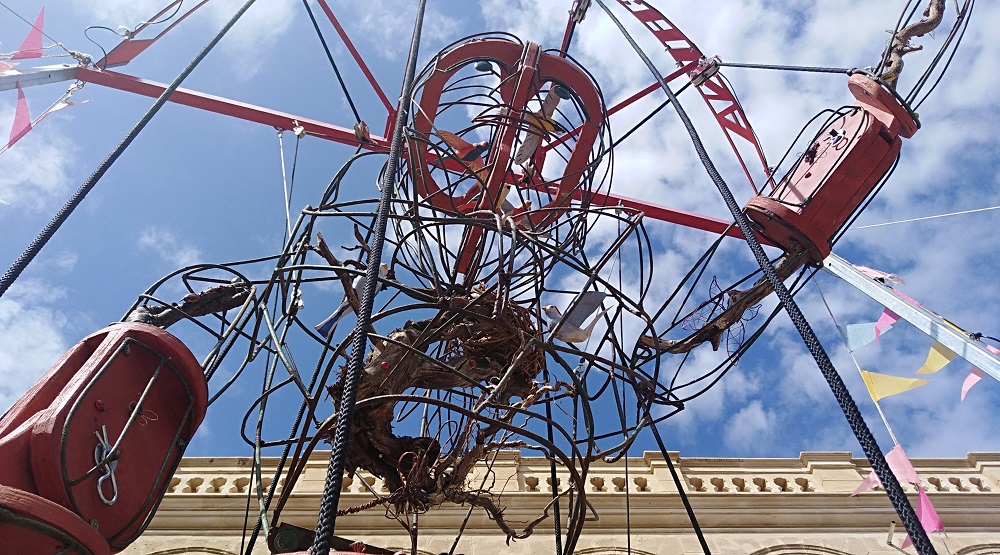 Un capítol apart és la marioneta de cinc metres, feta de diversos materials, entre el ferro i la fusta, que els espectadors podien manipular tirant d’unes cordes: cap, braços i cames. Es tracta d’una peça realment bonica, tota ella una vertadera obra d’art, una recreació que en certa manera és un homenatge als materials nobles que utilitzen els titellaires als seus tallers, la fusta en primer lloc -el moll de l’os del cos de la marioneta està constituït per unes branques de fusta- i el ferro, deixant a la vista els interiors del personatge.