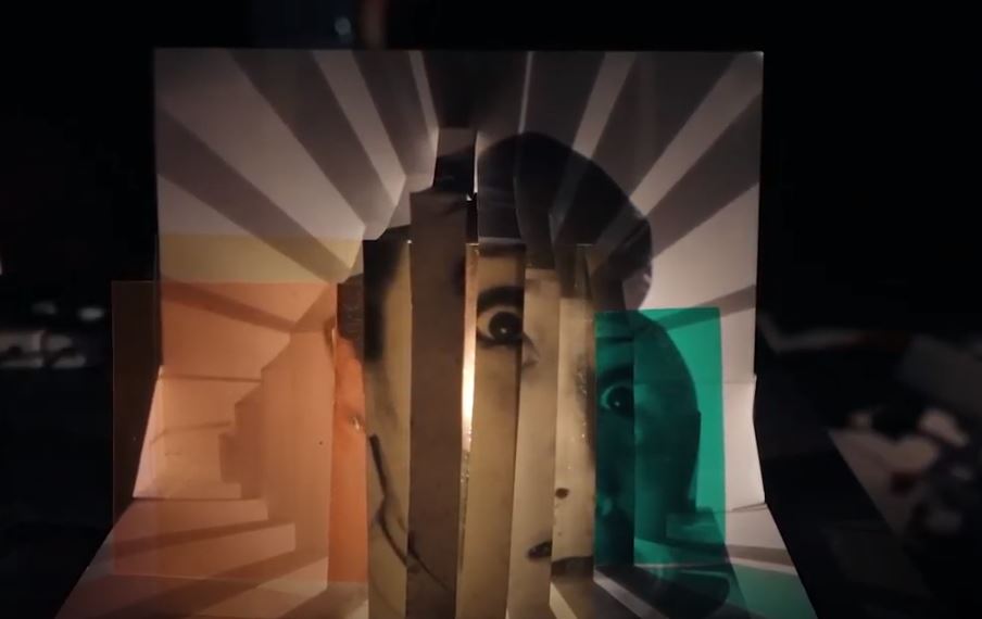 La boca del teatre de marionetes on tot això passa es converteix així en una caixa màgica on veiem com l’espai es modifica, com de la superfície més pura i blanca de sobte s’obre una escletxa de la que brolla un color o una realitat altre, o quan una composició de plans transparents de colors s’entrecreuen formant un espai de dimensions complexes, que obliguen a la protagonista a desdoblar-se en un plegat de figures.