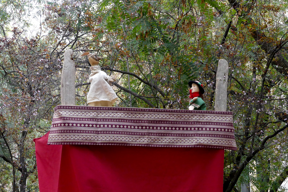 Com a representant del titella de guant, ha actuat Pere Bigas de la Cia. l’Argos Maltès amb el seu Putxinel·li i Tereseta, molt ben portat, amb una estupenda interpretació dels personatges clàssics del teatre de guant, accions reconegudes, un ritme adequat, i titelles estèticament bells. Pere Biges ha captat l’atenció del públic des d’una estructura senzilla, que deixava al descobert la seva interpretació pel costat oposat al públic, des d’on alguns curiosos hem pogut observar com mantenia l’escena malgrat les gotes que amenaçaven amb suspendre l’actuació. Es podria dir que en Pere Bigas ha aconseguit mantenir la pluja a ratlla, donant temps i espai al seu personatge Putxinel·li per vèncer la mort i tornar als braços de la seva estimada Tereseta.