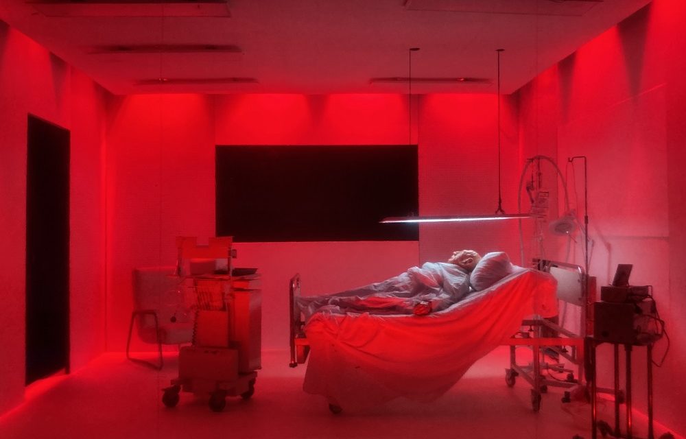 La dura mirada de la proposta dels alumnes de 4art Visual -Joana Vulart, Gerard Pla, Asier Gilabert i Tomeu Quetglas- i de l’equip d’escenografia – Aleix García Valle, Ona Guilera Vizuete-, amb l’assistència de Laura Capdevila Millet per a la construcció dels titelles i objectes, i Adrià Girona Aguilar en l’espai sonor, no deixa ‘títere con cabeza’, com es diu en castellà, quan s’encara amb tota la parafernàlia que envolta allò que per a ells és vist com una ‘indústria de la mort’ i com una renúncia al cos real. Tots els personatges porten una màscara grotesca casi de pel·lícula de terror, d’aquestes que desfiguren grotescament el rostre humà, mentre el malalt apareix com un cos al qual se li pot fer tot el que es vulgui.