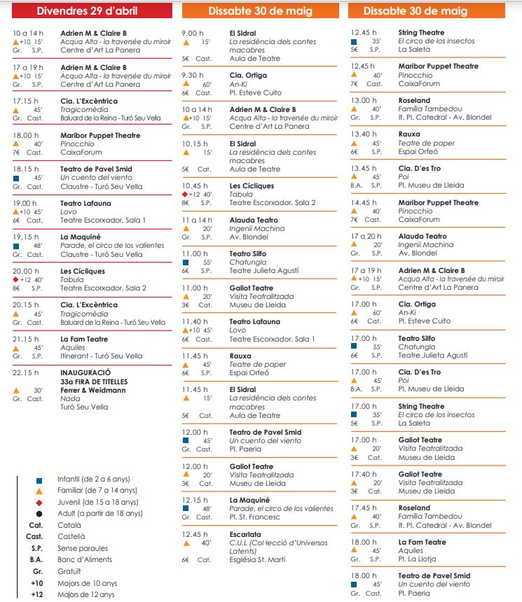 S’inicia el proper divendres 29 d’abril la 33a edició de la Fira de Titelles, que organitza el Centre de Titelles de Lleida, amb direcció d’Elisabet Vallvé i Oriol Ferre. Una Fira que aquest any retorna a la seva plena normalitat després de l’impàs provocat per la pandèmia del COVID-19, que va truncar el ritme imparable de creixement que tenia la Fira des de que l’any 1990 fos iniciada per Julieta Agustí i Joan-Andreu Vallvé.